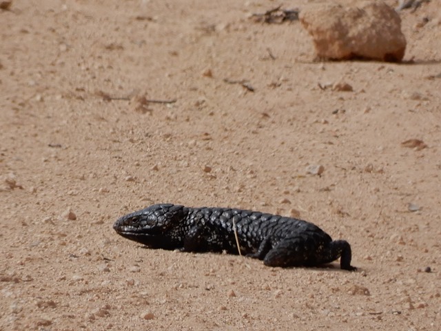 Shingleback Lizard. He was a chunky guy with an attitude. He stuck out his blue tongue at us as we came close (too slow with the camera).